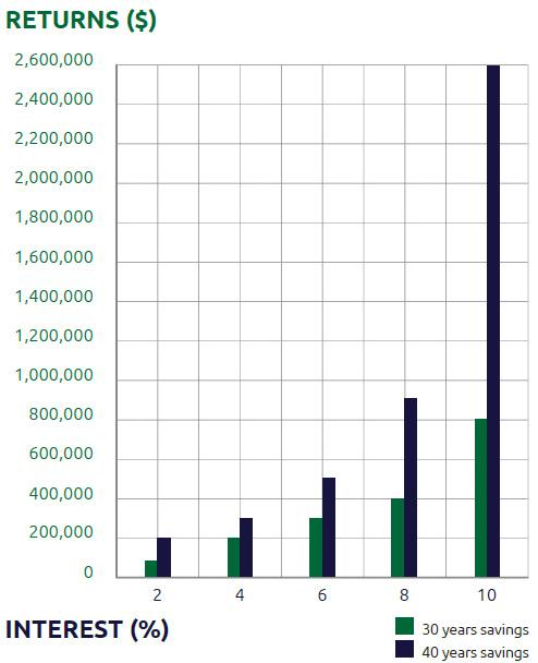 However, if only you had started saving 10 years earlier, which make the total term to 40 years, there is a even greater difference. At 12% returns p.a., your returns is are now at $2,577,427 instead of just $810,878! No gimmicks but just plain old mathematics!